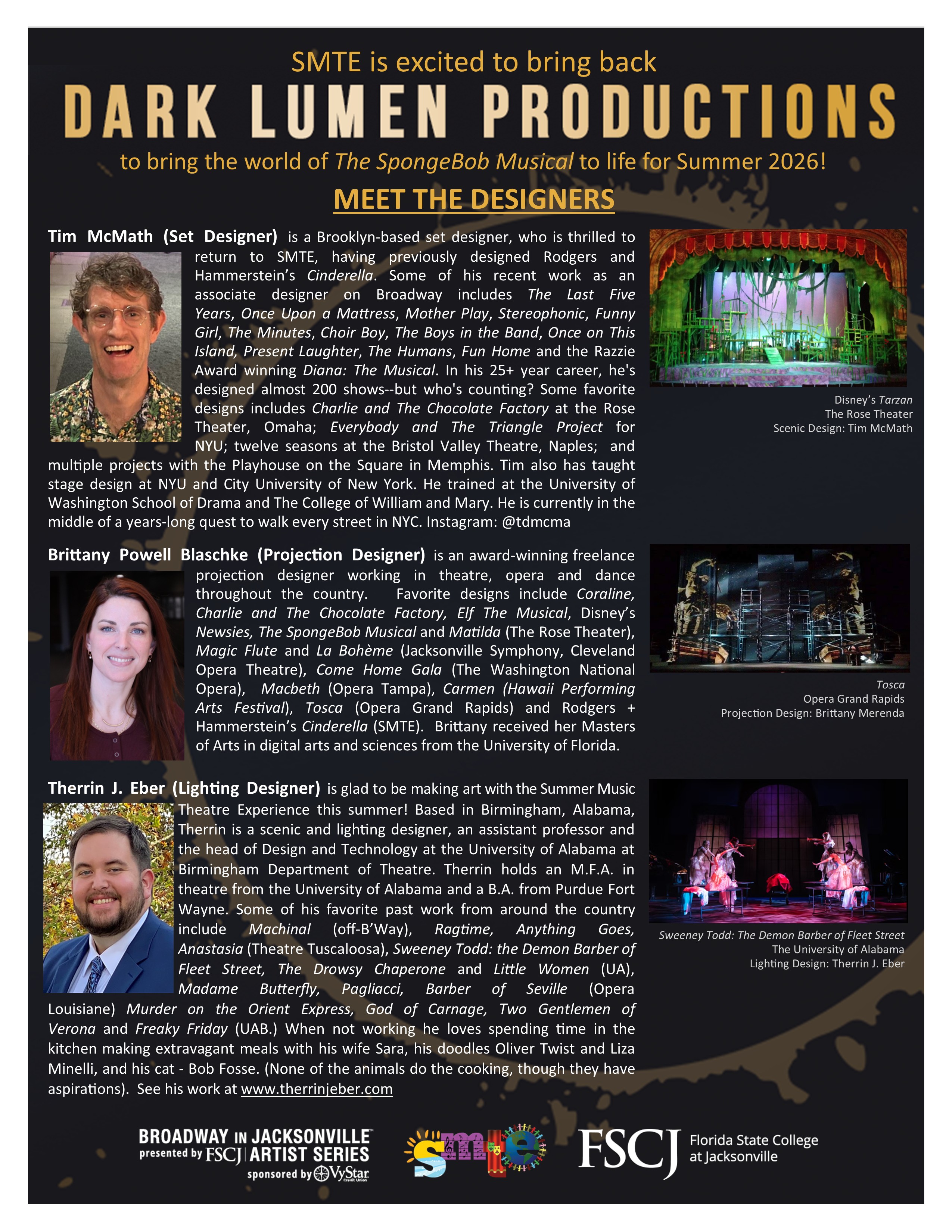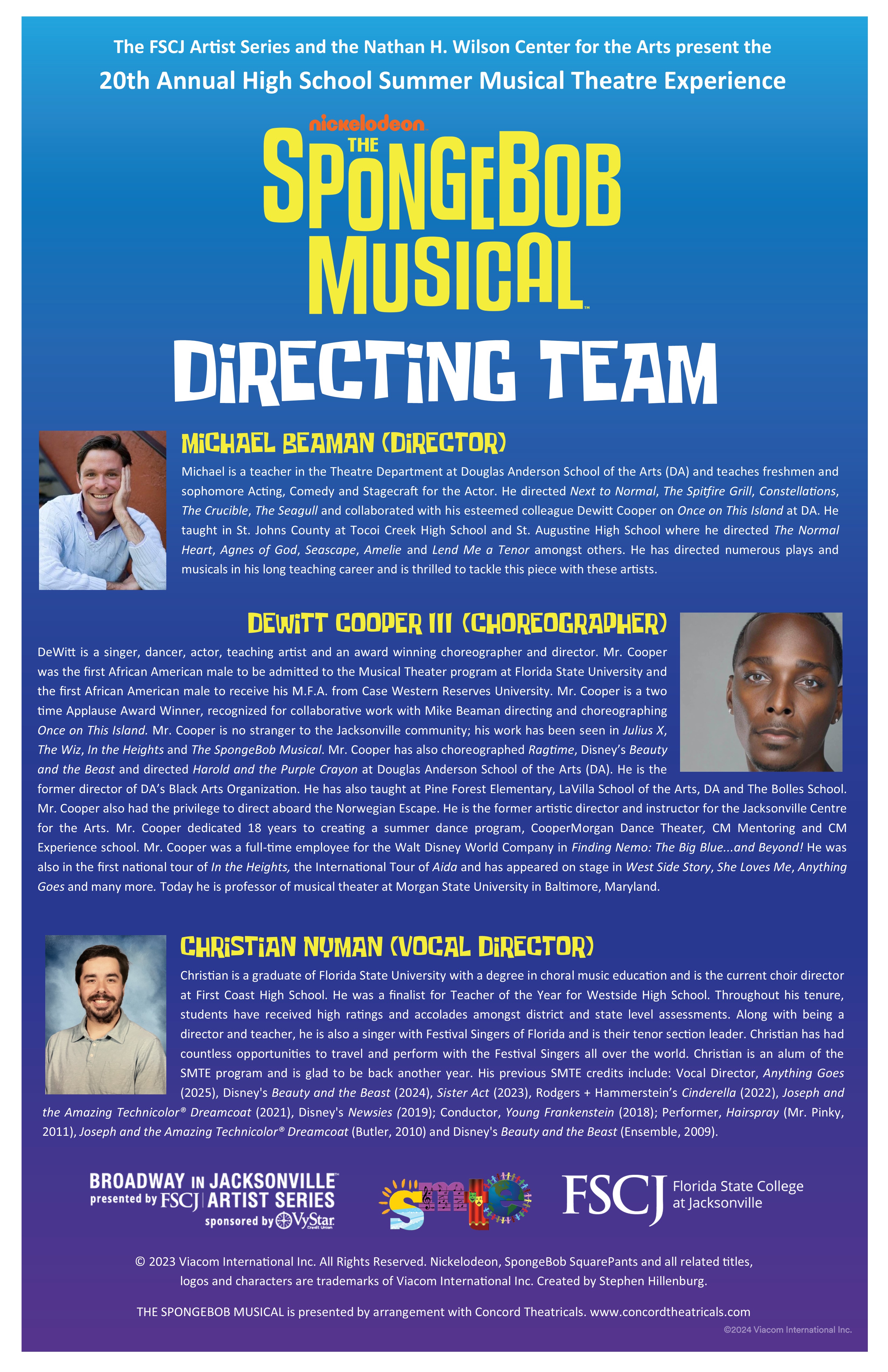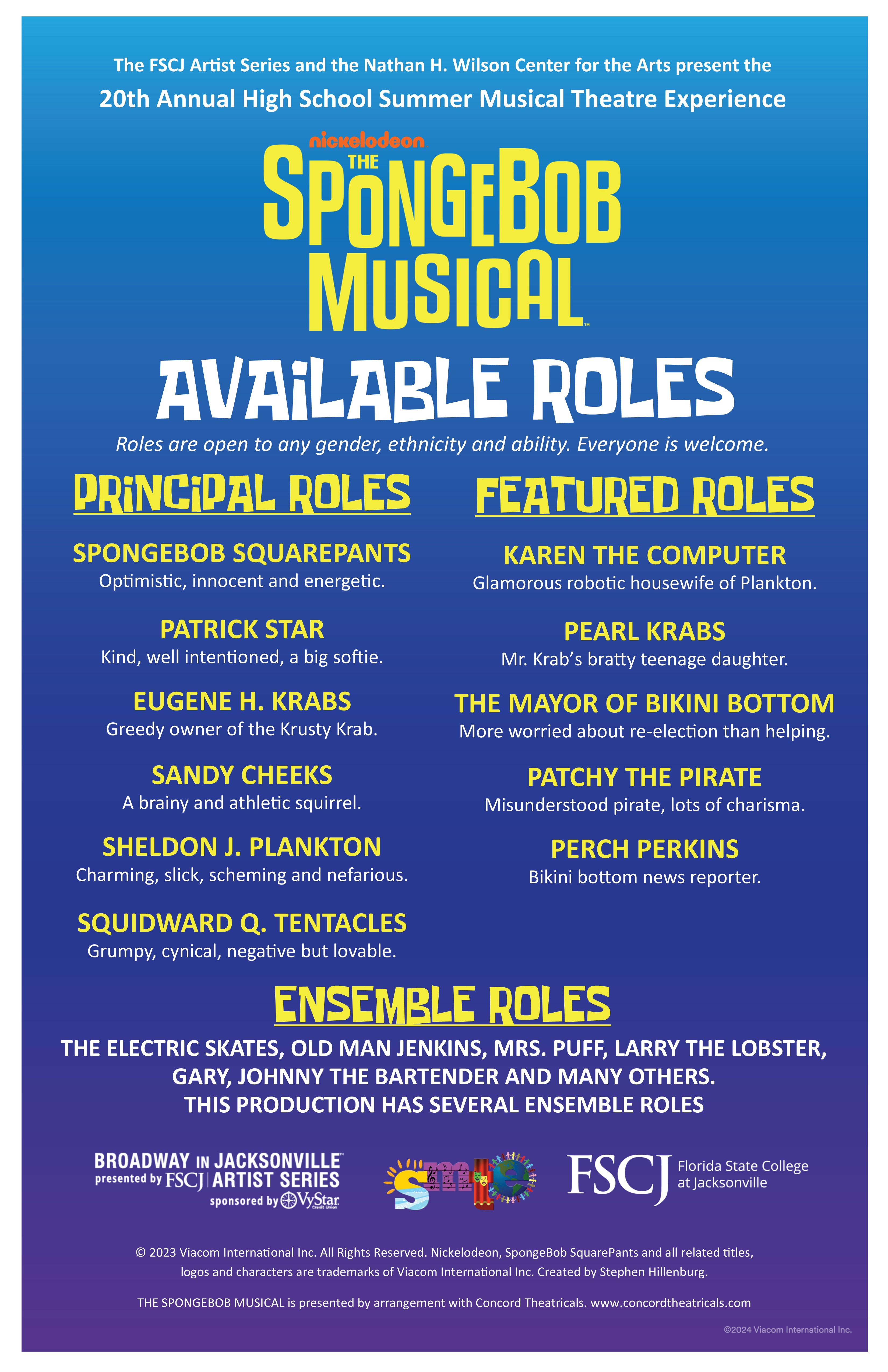 The Florida State College at Jacksonville High School Summer Musical Theatre Experience is celebrating its 20th year providing theatre opportunities to 7th-12th graders in the First Coast area. This summer, more than 70 student performers and technicians will train with professional theatre artists in preparation for our production of The SpongeBob Musical!